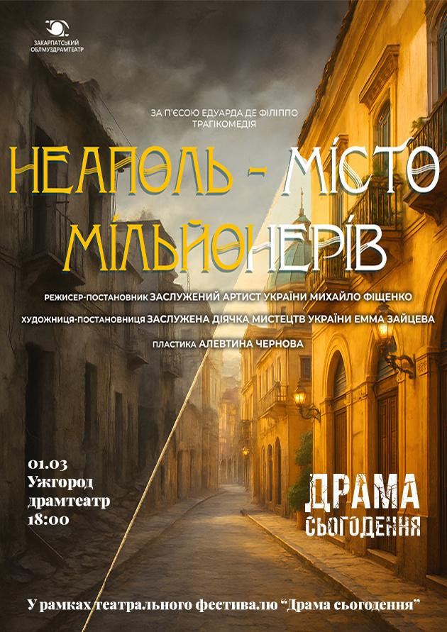 Вистава "Неаполь місто мільйонерів " створена за п'єсою відомого італійського драматурга, актора, режисера, автора неаполітанського театру Едуардо де Філіппо. У виставі порушуються гострі питання виживання під час війни: вибір між порядністю та вигодою, совістю й розрахунком, вірністю та грошима.