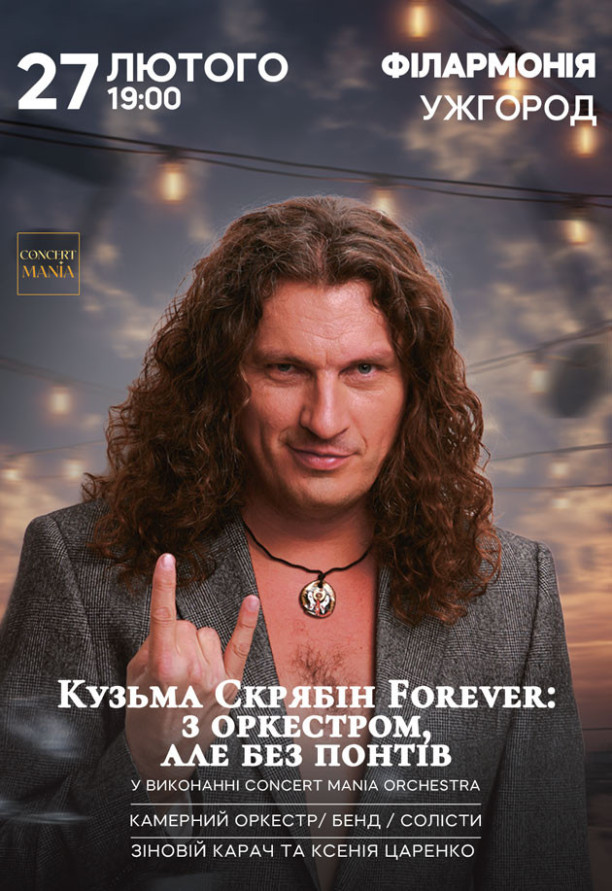 Теплі мелодії, улюблені хіти, душевна атмосфера – в триб’ют-концерті «Кузьма Скрябін Forever: з оркестром, але без понтів» у виконанні «Concert Mania Orchestra» та солістами Зіновієм Карачем і Ксенією Царенко. Чекаємо вас 27 лютого о 19:00 в Закарпатській обласній філармонії, аби разом насолодитися творчістю людини, яка змінила нашу музику назавжди.