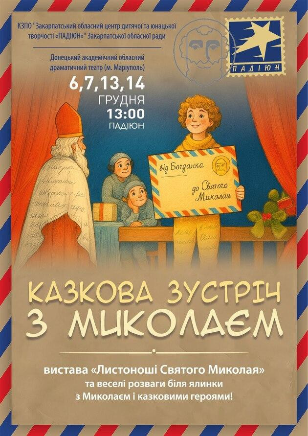 На вас чекає добра вистава «Листоноші Святого Миколая», а також веселі розваги біля ялинки з Миколаєм та казковими друзями.